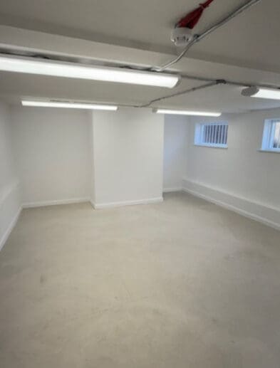 A storage room cluttered with shelving was stripped back. We embraced an industrial aesthetic, installing surface-mounted electrical conduit and pipework, laying a self-levelling screed floor and refreshing the walls with new plaster and industrial-style decoration.